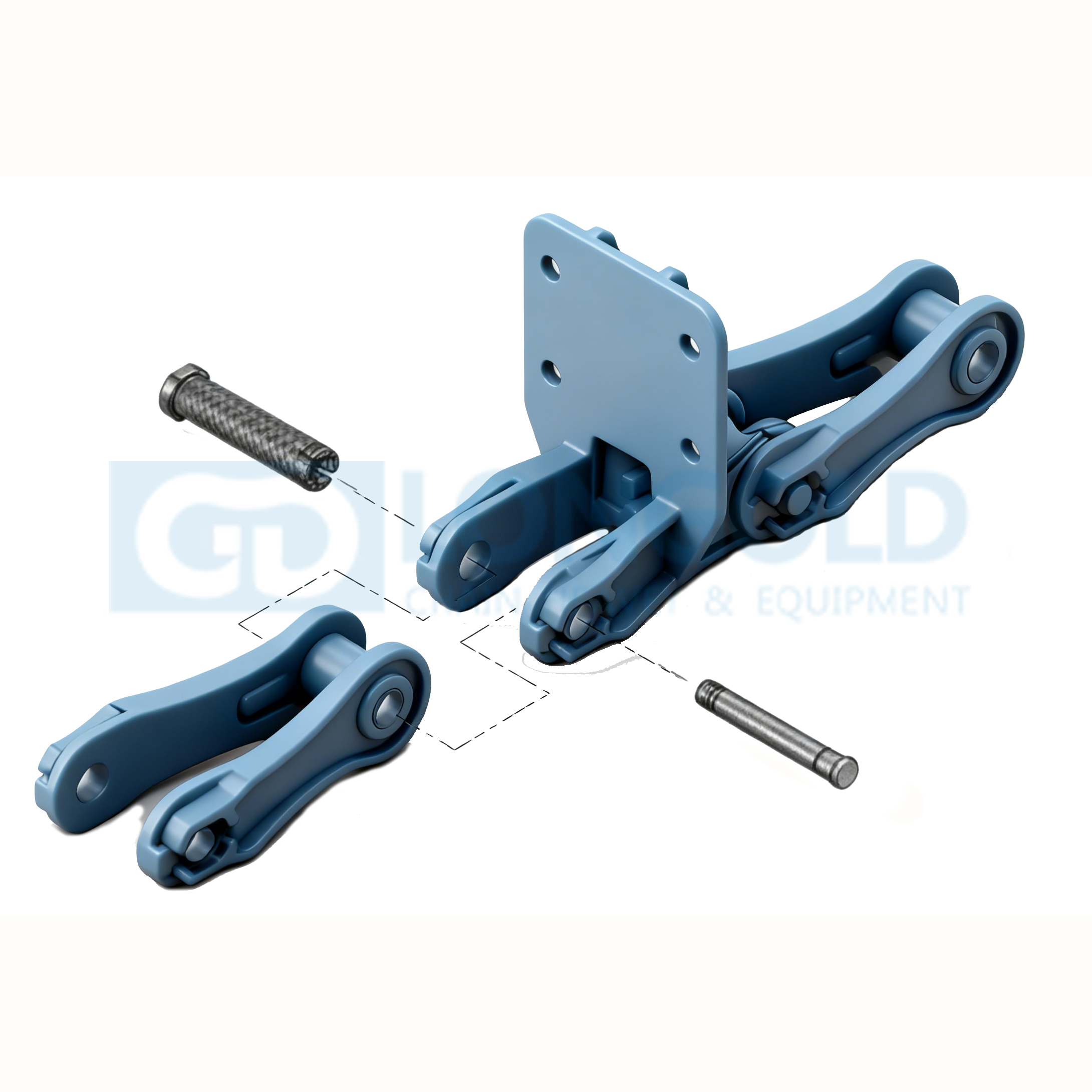 由于需要與污水直接接觸,所以這兩款規格的污水處理鏈除銷軸外,其它部件均采用工程塑料材質。